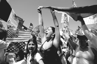 | 중남미 출신 미국 이민자들이 2006년 4월 9일 미국 캘리포니아주 샌디에이고에서 열린 反이민법 저지 시위에 참가해 미국 국기와 출신국 국기를 함께 흔들며 행진하고 있다. |