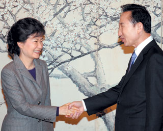 - 지난 2월 2일 청와대에서 만나 악수를 나누는 이명박 대통령과 박근혜 전 대표. ‘현재 권력’인 이명박 대통령과 ‘미래 권력’인 박근혜 대표가 협력해야 한나라당에 길이 있을 것이다.