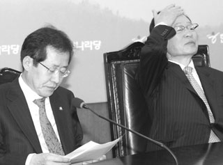 | 지난 1월 7일 오전 한나라당 당사에서 최고위원들의 발언을 듣고 있는 박희태(오른쪽) 대표와 홍준표 원내대표. |