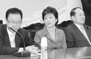 | 지난 1월 5일 한나라당 최고위원ㆍ중진회의에 참석한 박희태 대표, 박근혜 전 대표, 이상득 전 국회 부의장. |