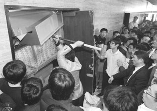 | 작년 12월 18일 韓美 FTA 비준동의안 상정 저지를 위해 회의실 문을 해머로 부수는 민주당 관계자들. 국회 다수당인 한나라당은 야당의 폭력을 수수방관했다. |