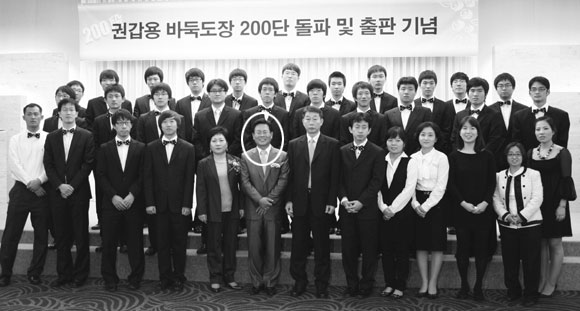 | 지난 10월 21일 서울 반포의 팔래스호텔에서 권갑용 도장 200단 돌파 기념 행사가 열렸다. 앞줄 왼쪽에서 6번째가 권갑용 七단, 왼쪽이 부인 박옥주씨. |