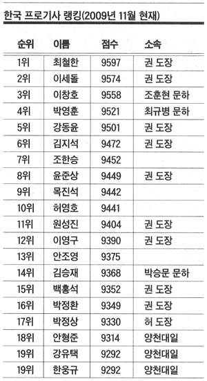 랭킹 20위 안에 권 도장 출신의 젊은 강자들이 절반을 차지하고 있었다. ‘칠검’에 들지 않은 이영구(1987년생, 2001년 입단)가 12위, 백홍석(1986년생, 2001년 입단)이 15위. 이쯤 되면 권 도장이 곧 한국 프로바둑이라고 할 수 있겠다.⊙
