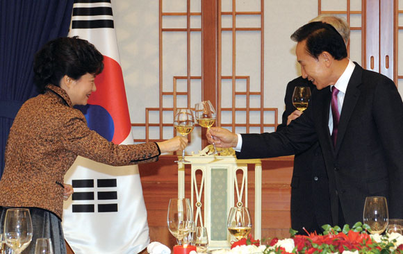 - 이명박 대통령은 박근혜 전 대표와의 갈등관계를 극복하고 상생의 정치로 나가야 한다. 사진은 작년 12월 헝가리 대통령 환영만찬에서 건배하는 이 대통령과 박 전 대표.