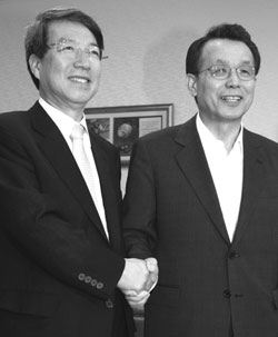 | 이명박 대통령의 ‘프로젝트 리더십’은 한승수 전 총리(오른쪽)에게는 자원외교, 정운찬 총리에게는 세종시 문제를 맡긴 인사에서도 나타난다. |