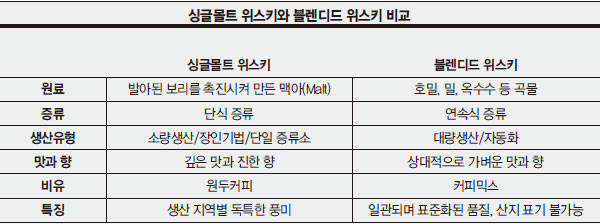 싱글몰트 위스키란 발아된 보리 원료를 100% 사용해 한 곳의 증류소에서 만든 원액(原液)을 숙성시킨 위스키를 말한다. 이와 달리 블렌디드(Blended) 위스키는 싱글몰트 위스키(20~30%)와 그레인 위스키(70~80%·호밀 옥수수 등으로 만든 곡물 위스키)를 섞어 만든 위스키이다. 디아지오사(社)의 조니워커(Johnnie Walker)나 페르노리카의 발렌타인(Ballantine’s)이 대표적인 블렌디드 위스키이다.