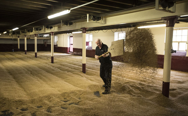 | 발베니의 상징 플로어몰팅. 이틀간 물에 담가 놓았다가 꺼낸 보리를 바닥(플로)에 깔아 놓고 발아시키는 과정이다. 싹이 트는 데 대략 4~5일이 걸린다. |