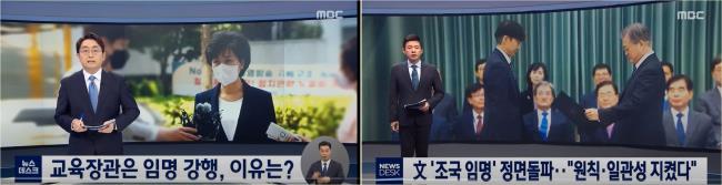MBC노조는 더 나아가 2019년 9월 9일 문재인 당시 대통령이 조국 법무부 장관을 임명했을 때, MBC 뉴스데스크의 보도행태도 상기시켰다. MBC노조는 “자녀 입시비리 의혹과 그와 관련된 가족 기소, 극심한 반대 여론과 국회 청문보고서 채택 불발에도 불구하고 임명한 것은 강행 아니냐?”고 물은 뒤, “당시 뉴스데스크 보도는 문 대통령의 결정을 2꼭지로 자세히 전하면서 시종 ‘정면 돌파’라는 표현만 거듭 사용했다. ‘강행’이란 용어는 전혀 나오지 않는다”고 지적했다. MBC노조는 “대신 ‘문 대통령이 많이 고민했는데, 원칙과 일관성을 지키기 위해 힘들게 결단했다’라고 적극적으로 해명해주기까지 했다”고 꼬집었다.