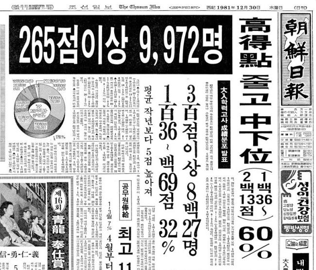 - 조선일보는 1981년 12월 30일 1면에 학력고사 성적분포 발표 소식을 비중있게 다루었다.