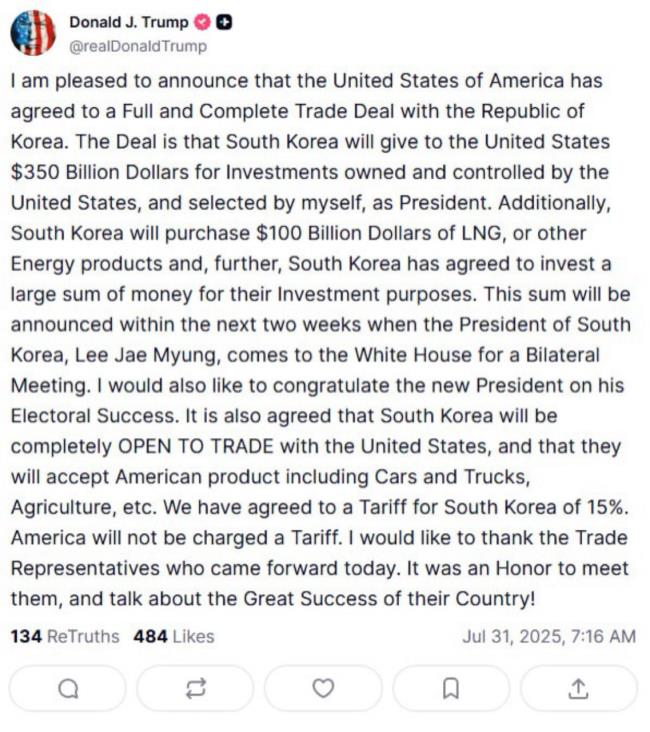 µµ³Îµå Æ®·³ÇÁ ¹Ì±¹ ´ëÅë·ÉÀº 30ÀÏ(ÇöÁö ½Ã°¢) ¹é¾Ç°ü¿¡¼ ±¸À±Ã¶ °æÁ¦ºÎÃѸ® °â ±âȹÀçÁ¤ºÎ Àå°ü µî Çѱ¹ Çù»ó ´ëÇ¥´Ü°ú ȸ´ãÇÑ µÚ ¼Ò¼È¹Ìµð¾î(SNS) Æ®·ç½º¼Ò¼È¿¡ "¿À´Â 8¿ù 1ÀϺÎÅÍ Çѱ¹¿¡ 25% »óÈ£°ü¼¼¸¦ ºÎ°úÇÒ ¹æÄ§À̾ú´Âµ¥, À̸¦ 15%·Î ÀÎÇÏÇØÁÖ°í ¼ö¹éÁ¶¿ø ±Ô¸ðÀÇ ÅõÀÚ¸¦ ¾à¼Ó¹Þ¾Ò´Ù°í ¹àÇû´Ù.