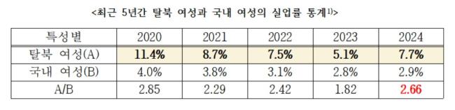 ºÏÇÑÀÌÅ»ÁÖ¹ÎÁö¿øÀç´ÜÀÌ ¿Ü±³ÅëÀÏÀ§¿øÈ¸ ¼Ò¼Ó ¾Èö¼ö ÀÇ¿ø½Ç¿¡ Á¦ÃâÇÑ ÀÚ·á¿¡ µû¸£¸é, Å»ºÏ ¿©¼ºÀÇ ½Ç¾÷·üÀº ±¹³» ¿©¼º ´ëºñ 2.6¹è ÀÌ»óÀ¸·Î ³ªÅ¸³µ´Ù.