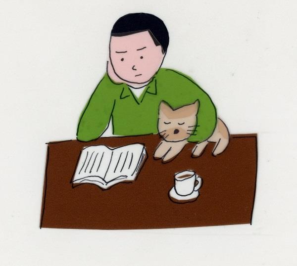- 서울 강남구 플랫폼엘 컨템포러리 아트센터에서 열린 기획전 ‘하루키를 말할 때 우리가 하고 싶은 이야기’에 전시된 일러스트레이터 안자이 미즈마루의 작품. 책상 앞에 앉아 책을 읽는 남자와 그의 팔 곁에서 잠든 작은 강아지를 단순한 선과 평면적 색채로 그려 넣었다. 책상 위에는 펼쳐진 책과 커피잔이 놓여 있어 조용한 독서의 시간을 암시한다.