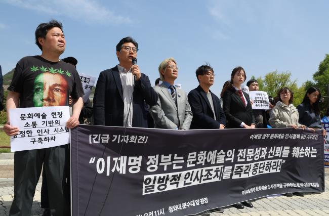 문화예술계 인사들은 21일 청와대 앞에서 기자회견을 열고 "공공 문화예술기관 인사의 기준과 원칙을 공개하고, 현장과 소통하는 공정한 인사 시스템을 구축하라"며 성명을 발표했다. 성명에는 문화예술 관련 65개 단체와 794명이 이름을 올렸다.