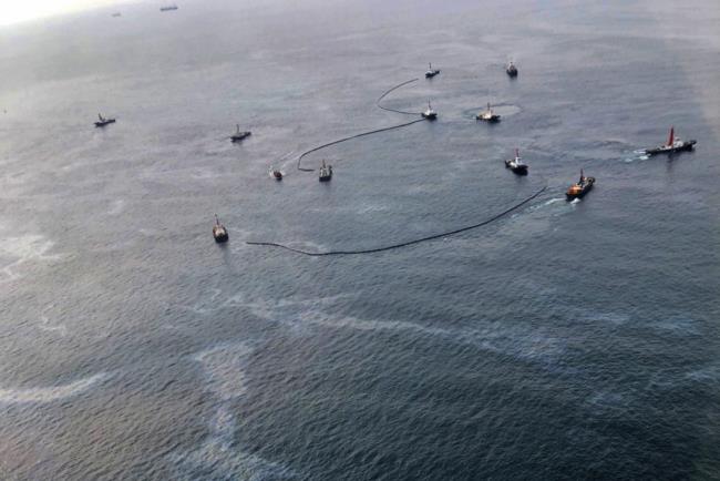 - 2022년 2월 11일 태국 동부 해안에서 발생한 기름 유출 사고. 정화 작업이 한창이다. 사진=뉴시스/AP