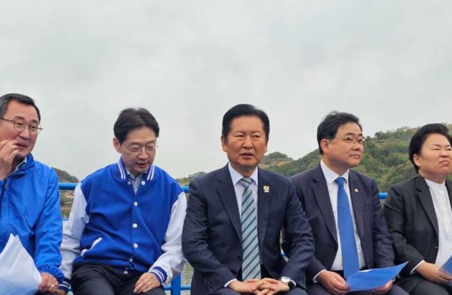 - 22일 오전 경남 통영시 욕지도 선상에서 열린 더불어민주당 최고위원회의에 참석한 정청래 대표. 사진=뉴시스