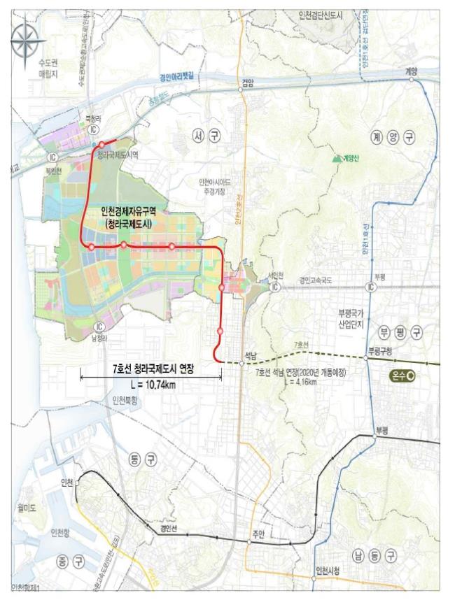 대도시권광역교통위원회는 ‘서울도시철도 7호선 청라국제도시 연장사업’ 기본계획을 승인하고, 7월 16일자로 관보에 고시했다. 서울도시철도 7호선 청라국제도시 연장사업은 연장 10.7km, 정거장 6개소에 총사업비는 1조 2,977억 원으로 인천 서북부 지역의 대중교통 편의를 개선하기 위해 추진된다. 계획에 따르면, 인천광역시 서구 석남동에서 공항철도 청라국제도시역이 연결된다.
