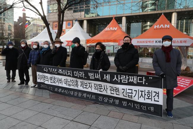 - 1월 12일 오후, 서울 중구 동화면세점 앞에서 열린 이재명 변호사비 대납 의혹 제보자 의문사 관련 기자회견에서 참석자들이 발언하고 있다. 사진=조선일보DB