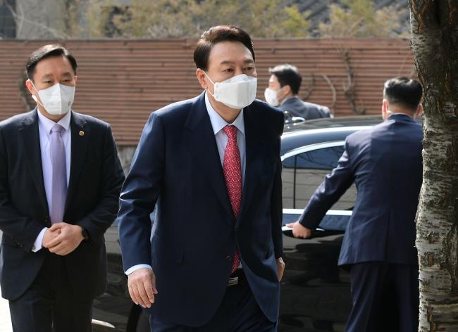 - 3월 16일 윤석열 대통령 당선인이 서울 종로구 통의동 금융감독원 연수원에 마련된 당선인 집무실로 출근하고 있다. 사진=국회 사진기자단