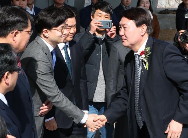 - 검찰총장 시절인 2020년 2월 13일 부산 연제구 부산지검을 방문한 윤석열 당선인(맨 오른쪽)이 ‘윤석열 사단’으로 꼽히는 당시 한동훈 부산고검 차장과 악수하고 있다. 사진=조선일보DB