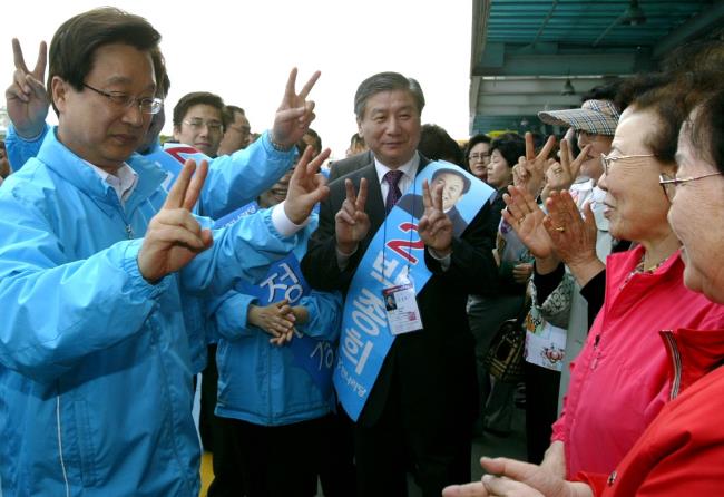 - 4.9 총선을 이틀 앞 둔 2008년 4월 7일 오후 경기 수원 구운동 농협 하나로 마트에서 지원유세를 마친 한나라당 강재섭 대표가 유권자들에게 한표를 호소하고 있다. 사진=뉴시스