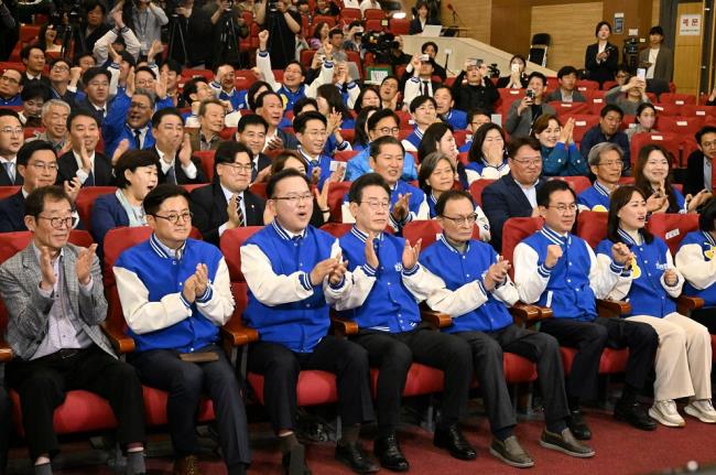 - 4월 10일 이재명 더불어민주당 상임공동선대위원장과 참석자들이 국회 의원회관 대회의실에 마련된 제22대 국회의원선거 개표 상황실에서 방송3사 출구조사 결과 압승 전망이 발표되자 박수치고 있다. 사진=조선DB