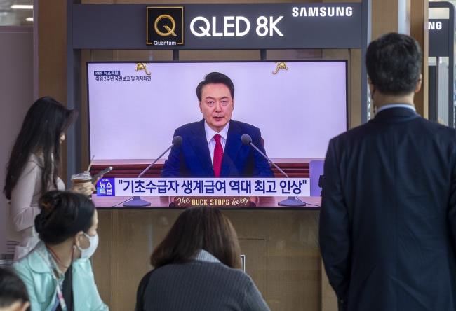 - 2024년 5월 9일 오전 서울 용산구 서울역 대합실에서 시민들이 '윤석열 정부 2년 국민보고 및 기자회견' 방송을 시청하고 있다. 사진=조선DB