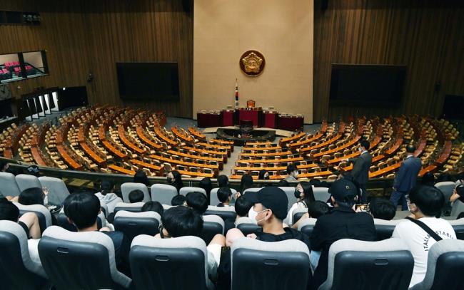 - 21대 국회 때인 2022년 6월 9일 원구성 협상 난항으로 국회 공백 상태가 장기화되는 가운데 국회를 참관한 학생들이 텅 빈 본회의장에서 관계자의 설명을 듣고 있다. 사진=조선DB