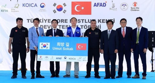 - 11일 오전(현지시각) 튀르키예 하타이 주(州)에서 개최된 ‘한국-튀르키예 우정마을’ 이양식에서 참석자들이 기념사진을 촬영하고 있다. (좌측부터) 오르한 타타르 튀르키예 재난관리청 지진 및 리스크 감소 국장, 레술 일리딤 튀르키예 하타이주 부주지사, 정연두 주튀르키예 한국대사, 장원삼 코이카 이사장, 정태영 세이브더칠드런 코리아 총장, 김중곤 굿네이버스 인터내셔날 사무총장, 유원식 한국국제기아대책기구 명예회장