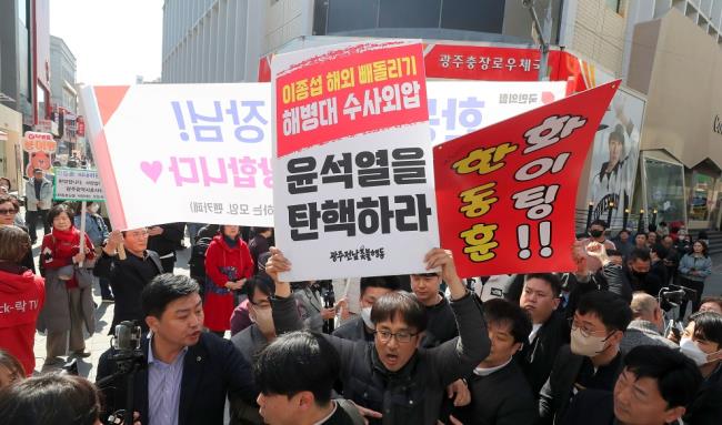 - 2024년 3월 15일 한동훈 국민의힘 비대위원장이 광주 동구 충장로에 도착하기 전 국민의힘과 더불어민주당 등 양당 지지자들이 맞불피켓시위를 하고 있다. 사진=조선DB