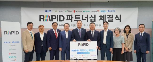 코이카는 21일 오후, 경기도 성남시 코이카 본부에서 신한은행을 비롯해 5개 NGO(굿네이버스, 희망친구 기아대책, 세이브더칠드런, 초록우산 어린이재단, 월드비전), 국제개발협력민간협의회(KCOC)와 ‘RAPID(Responsive Actions and Partnership Initiative for Disaster‧해외재난대응협력이니셔티브)’ 사업 파트너십을 체결했다.