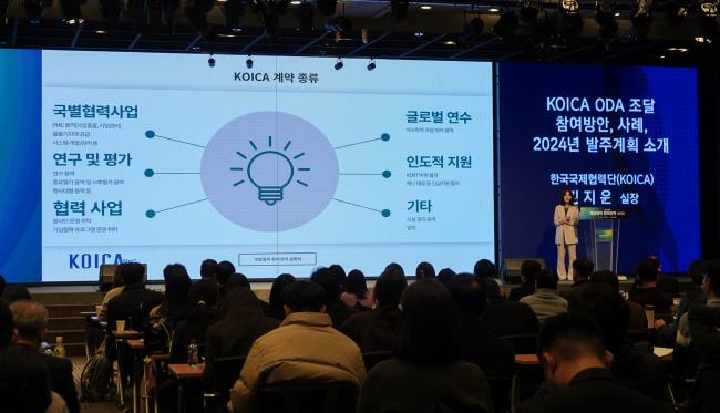 - 코이카는 개발도상국의 빈곤 퇴치, 탄소 감축 등을 지원하는 해외 ‘공적개발원조(ODA)’ 사업에 우리 민간 기업들이 참여할 수 있도록 다양한 지원 활동을 하고 있다. 지난 3월 서울 여의도 중소기업중앙회 KBIZ홀에서 코이카 주관으로 열린‘2024 개발협력 참여전략 설명회’에서 김지윤 코이카 조달실장이 해외 ODA 참여 방안 등을 설명하고 있다.