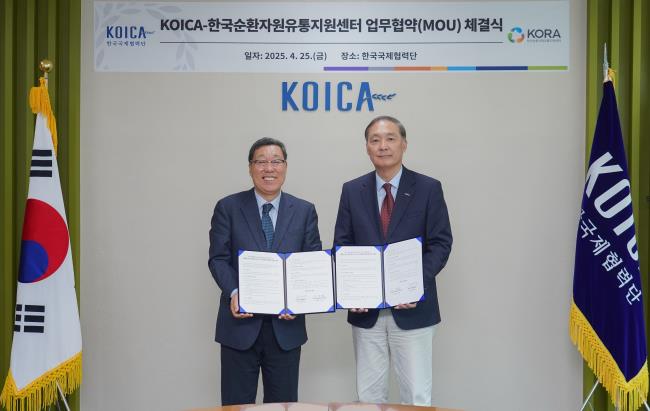 코이카는 기후변화주간* 중 25일 오후 경기도 성남시 코이카 본부에서 한국순환자원유통지원센터(이하 KORA)와 폐기물 재활용 및 자원순환 분야 협력을 위한 업무협약을 체결했다.