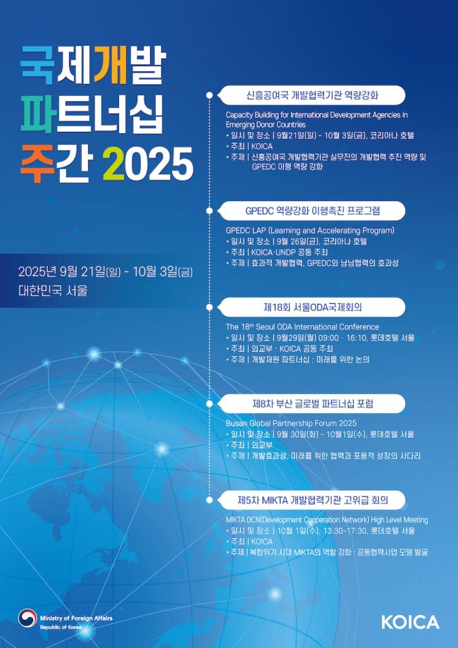 코이카(KOICA, 한국국제협력단)는 9.21.(일)-10.3.(금) 간 서울에서 외교부와 공동으로 「2025 국제개발 파트너십 주간」을 개최한다. 이번 주간에는 제18회 ‘서울 공적개발원조(ODA) 국제회의’(9.29.), 제8차 ‘부산 글로벌 파트너십 포럼’(9.30.-10.1.), ‘믹타(MIKTA) 개발협력기관 협의회 고위급 회의’(10.1.), 제30차 ‘효과적인 개발협력을 위한 글로벌 파트너십(GPEDC) 운영위원회’(10.1.) 등이 진행될 예정이다. 이번 주간에는 100여 개국 정부 및 10여 개 국제기구 대표단, 기업, 학계, 시민사회 등 국내외 개발협력 활동 주체들이 참석하여 국제개발협력 도전 과제와 발전 방향에 대해 논의할 예정이다.