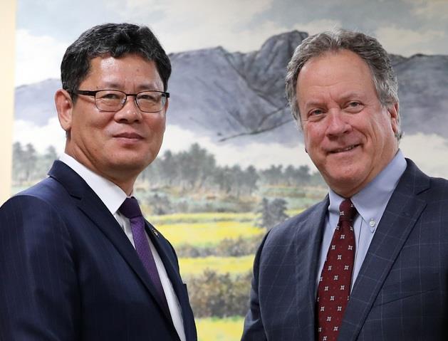 - 김연철 통일부장관(왼쪽)이 지난달 13일 집무실에서 유엔 세계식량계획(WFP)의 데이빗 비즐리 사무총장과 만나 인사를 나누고 있다. 사진=뉴시스