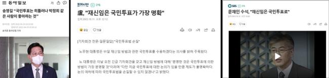 하지만 송영길 전 대표는 그런 발언을 하면서 깜박 잊은 게 있는 듯 하다. 바로 송영길 전 대표와 더불어민주당이 경애하는 노무현 전 대통령, 문재인 현 대통령도 과거 국민투표를 주장한 적이 있다는 사실 말이다.