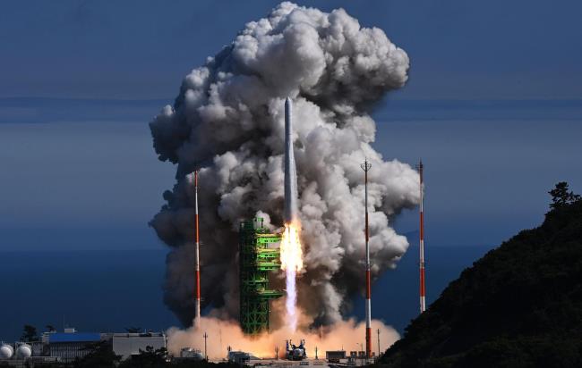 - 순수 국내 기술로 설계 및 제작된 한국형 발사체 누리호(KSLV-Ⅱ)가 21일 전남 고흥군 나로우주센터 발사대에서 화염을 내뿜으며 우주로 날아오르고 있다. 실제 기능이 없는 모사체(더미) 위성만 실렸던 1차 발사와 달리 이번 2차 발사 누리호에는 성능검증위성과 4기의 큐브위성이 탑재됐다.