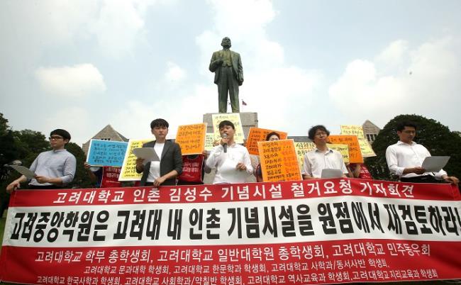 - 2017년 7월 12일 서울 성북구 고려대학교에서 고려대 학부, 일반대학원 총학생회, 민주동우회 등 참석자들이 학교 내 인촌 기념시설 철거를 요구하고 있다. 사진=조선일보
