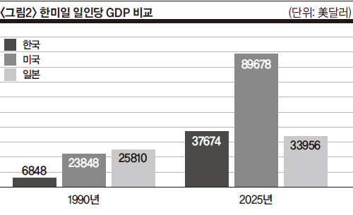 ÀϺ» °æÁ¦°¡ ¾È°í ÀÖ´Â ³»ºÎ ¸ð¼øÀÇ °á°ú·Î ³ªÅ¸³ ±â·ÏÀûÀÎ Àú¼ºÀåÀº ±¹Á¦ ºñ±³¿¡¼ ¶Ñ·ÇÇÏ°Ô µå·¯³´Ù. ¡´±×¸²2¡µ´Â ÇÑ¡¤¹Ì¡¤ÀÏÀÇ 1990³â°ú 2025³âÀÇ 1Àδç GDP¸¦ ºñ±³ÇÑ °ÍÀÌ´Ù. 1990³â¿¡´Â ¼¼ ³ª¶ó °¡¿îµ¥ ÀϺ»ÀÌ °¡Àå ³ôÀº ¼Òµæ ¼öÁØÀ» ±â·ÏÇßÀ¸³ª, ÇöÀç´Â ¿ÀÈ÷·Á °¡Àå ³·Àº ¼öÁØ¿¡ ¸Ó¹°·¯ ÀÖ´Ù. °°Àº ±â°£ Çѱ¹°ú ¹Ì±¹ÀÇ 1Àδç GDP°¡ °¢°¢ 450%¿Í 276% Áõ°¡ÇÑ ¹Ý¸é, ÀϺ»ÀÇ Áõ°¡À²Àº 32%¿¡ ±×ÃÆ´Ù. ÀÌ·¯ÇÑ ¼öÄ¡´Â ÀϺ» °æÁ¦°¡ Àå±â°£ Àú¼ºÀå¿¡ ¸Ó¹°·¯ ¿ÔÀ½À» ´ÜÀûÀ¸·Î º¸¿©ÁØ´Ù.