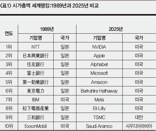 ¡´Ç¥1¡µÀº 1989³â°ú 2025³âÀÇ ¼¼°è ±â¾÷ ½Ã°¡ÃÑ¾× »óÀ§ 10À§¸¦ ºñ±³ÇÑ °ÍÀÌ´Ù. ¹öºí°æÁ¦ ºØ±« ÀÌÀüÀÎ 1989³â¿¡´Â ÀϺ» ±â¾÷ÀÌ ¼¼°è 10´ë ±â¾÷ °¡¿îµ¥ 8°³¸¦ Â÷ÁöÇϰí ÀÖ¾úÀ¸³ª, 2025³â¿¡´Â ´Ü ÇÑ °÷µµ Æ÷ÇÔµÇÁö ¸øÇÑ ¹Ý¸é ¹Ì±¹ ±â¾÷ÀÌ 8°÷À» Â÷ÁöÇϰí ÀÖ´Ù. ÀÌ´Â ÀϺ» ±â¾÷ÀÇ ±¹Á¦°æÀï·ÂÀÌ ±Þ°ÝÇÏ°Ô ¾àȵǾúÀ½À» ´ÜÀûÀ¸·Î º¸¿©ÁØ´Ù.