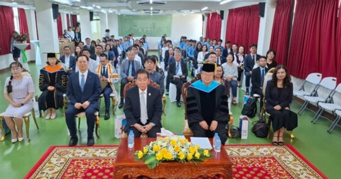 2025년 4월 8일 부영그룹이 설립한 우정 캄보디아 간호대학 개교식이 이 학교 강당에서 열렸다. 사진=부영그룹대한노인회장인 이중근 부영그룹 회장은 “살던 집에서 가족의 손을 잡고 편히 살 수 있도록 제도 개선이 필요하다. 예를 들어 요양보호사를 간호조무사 수준으로 전문성을 향상하고 부족한 인력은 해외 인력으로 보충하는 방안을 고려해야 한다”고 했다.