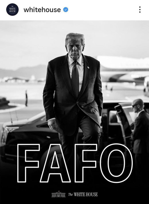 ¹Ì±¹ ¹é¾Ç°üÀº ¸¶µÎ·Î üÆ÷ Á÷ÈÄ Èæ¹é »çÁø Çϳª¸¦ °ø½Ä X(±¸ Æ®À§ÅÍ) °èÁ¤¿¡ ½Ç¾ú´Ù. Çѱ¹¿¡µµ º¸µµµÈ, 2025³â 10¿ù 30ÀÏ Æ®·³ÇÁ°¡ ±èÇØ°øÇ׿¡¼ ½ÃÁøÇΰú ȸ´ãÀ» ¸¶Ä£ µÚ À̵¿ÇÏ´Â ¸ð½À¿¡ ¡®No more games. FAFO¡¯¶ó´Â ¹®±¸¸¦ ´õÇÑ »çÁøÀÌ´Ù. ÇÊÀÚµµ óÀ½ ¾Ë¾Ò´Âµ¥, ¡®FAFO¡¯´Â ¡®Fxxx Around and Find Out¡¯(¡®Fxxx¡¯´Â ¡®F¡¯ÀÚ·Î ½ÃÀÛÇÏ´Â ¿å¼³-ÆíÁýÀÚ ÁÖ)ÀÇ ¾àÀÚ¶ó°í ÇÑ´Ù. ¡°±îºÒ´Ù°¡´Â ¾î¶»°Ô µÇ´ÂÁö ¾Ë°Ô µÉ °Í, ±îºÒ¸é ´ÙÄ£´Ù¡±´Â °·ÂÇÑ °æ°í¼º ¼Ó¾î(áÔåÞ)´Ù.