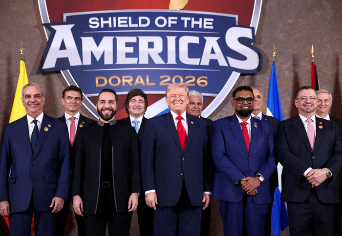 트럼프(가운데) 미국 대통령은 3월 7일 중남미 17개국 지도자가 참석한 ‘미주 반카르텔 연합’ 정상회의에서 마약 카르텔 지도자에 대한 공격 의지를 표명했다. 사진=로이터/연합뉴스미국이 현재 진행 중인 이란 전쟁의 궁극적인 타깃은 중국이다. 지난 3월 7일, 이를 잘 보여 주는 두 가지 일이 있었다. 플로리다 마이애미에서 열린 ‘아메리카 대륙을 위한 방패(Shield of the Americas)’라는 국제회의와, 이란 정유 시설에 대한 이스라엘 대공습이 그것이다.