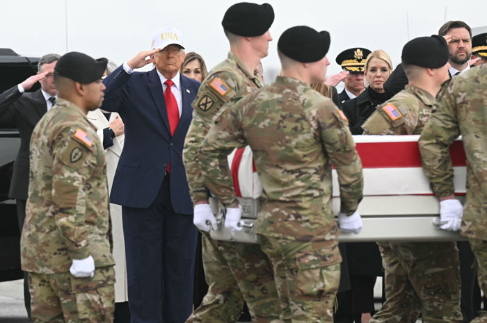 - 도널드 트럼프 미국 대통령은 지난 3월 7일 델라웨어주 도버 공군기지에서 쿠웨이트에서 사망한 미군 병사들의 유해를 맞이했다. 사진=AFP/연합뉴스