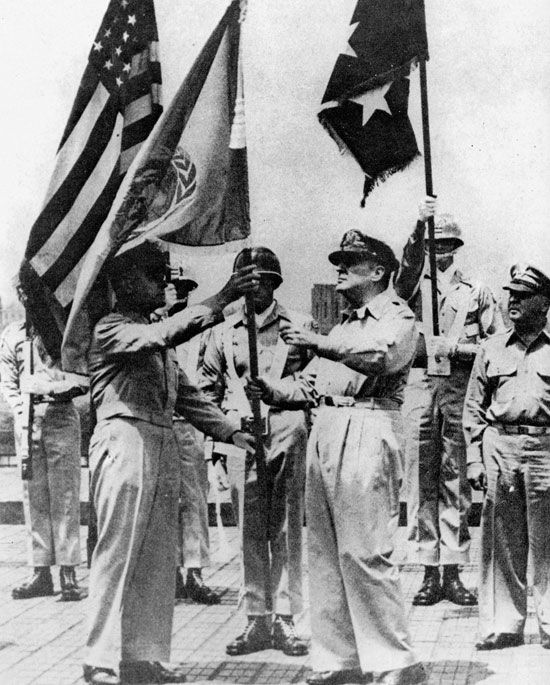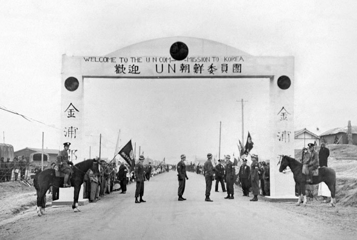 À¯¿£ °áÀÇ¿¡ µû¶ó Çѹݵµ¿¡¼ ħ·«±ºÀ» °ÝÅðÇϱâ À§ÇÑ ÅëÇÕ±ºÀÌ ±¸¼ºµÇ¾ú´Ù. 1950³â 7¿ù 14ÀÏ Äݸ°½º À°±ºÂü¸ðÃÑÀåÀ¸·ÎºÎÅÍ À¯¿£ ±ê¹ßÀ» Àü´Þ¹Þ°í ÀÖ´Â ¸Æ¾Æ´õ ¿ø¼ö. »çÁø=ÆÛºí¸¯ µµ¸ÞÀΡª Á¤¸» ±×·¡¾ß°Ú³×¿ä.