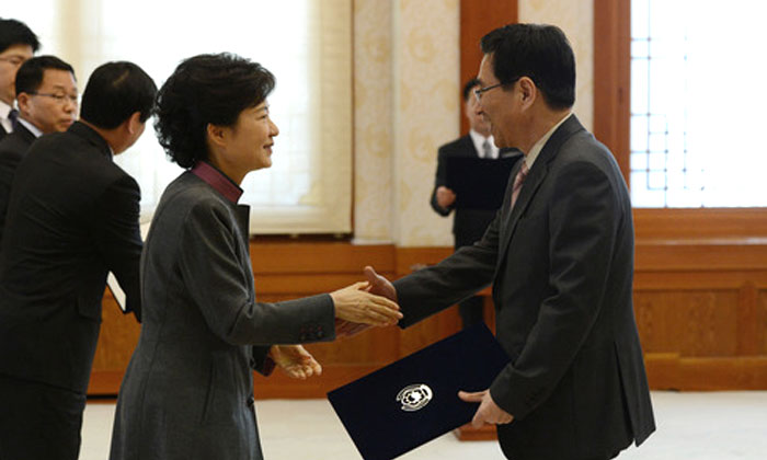 ¹Ú±ÙÇý ´ëÅë·ÉÀÌ 2013³â 3¿ù 25ÀÏ ¿ÀÈÄ Ã»¿Í´ë¿¡¼ ½ÅÀÓ Á¤¹«Á÷ ÀÓ¸íÀå ¼ö¿©½ÄÀ» °®°í Á¶¿øµ¿ °æÁ¦¼ö¼®¿¡°Ô ÀÓ¸íÀåÀ» ¼ö¿©Çϰí ÀÖ´Ù. »çÁø=Á¶¼±DB, û¿Í´ëÁ¶¿øµ¿ Àü ¼ö¼®Àº ½ÃÁ¾Àϰü Â÷ºÐÈ÷ ¸»Çß´Ù. Èí»ç »ý¹°ÇÐ Àü°øÀÚ¿Í ¾É¾Æ¼ ´ëÈÇÏ´Â ±âºÐÀ̾ú´Ù. ¿©ÀüÈ÷ °Ë»ö »çÀÌÆ®¿¡ ±×ÀÇ À̸§À» Ä¡¸é û¿Í´ë ¼ö¼® ½ÃÀý CJ±×·ì ÀÌ¹Ì°æ ºÎȸÀåÀÇ ÅðÁøÀ» ¿ä±¸ÇØ °ËÂû ¼ö»ç¸¦ ¹Þ¾Ò´Ù´Â °ÍÀÌ ¸ÕÀú ³ª¿Â´Ù.