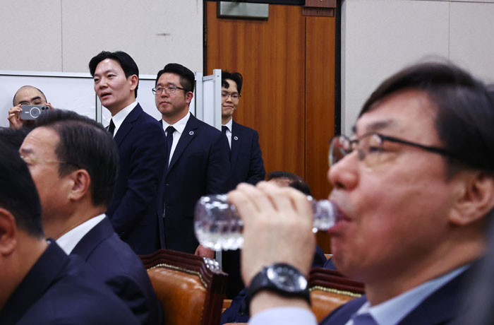 4월 14일 국회 국조특위 청문회에서 물을 마시고 있는 이화영 전 부지사 뒤로 박상용 검사가 증인 선서 거부에 대한 육성 소명 기회를 요청하고 있다. 사진=뉴시스― 이재명 대통령에 관한 진술을 대가로 처분상 이익을 주려고 했다는 주장도 있습니다.
