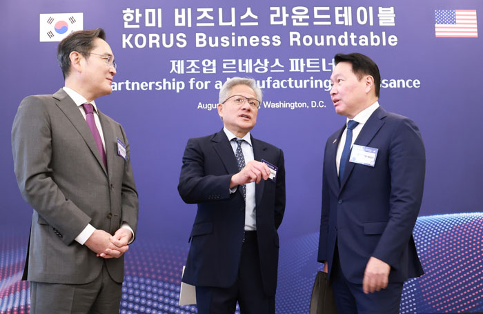 - 이재용(왼쪽) 삼성전자 회장, 최태원(오른쪽) SK그룹 회장이 2025년 8월 25일 한미 비즈니스 라운드테이블 리셉션에서 젠슨 황 엔비디아 CEO와 이야기를 나누고 있다. 사진=연합뉴스