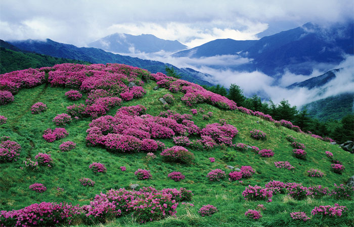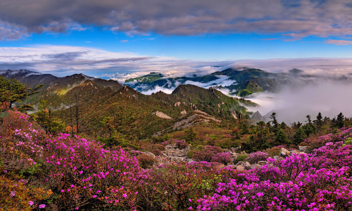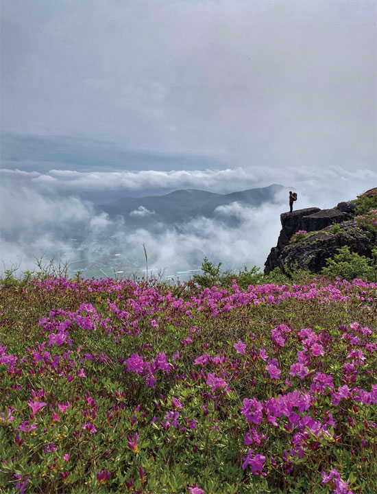 전남 장흥과 보성 경계의 사자산(667m) 철쭉 군락지. 호남정맥의 명불허전 자연 화원인 제암산과 일림산 사이에 사자산이 있다. 바닷바람을 맞으면서도 씩씩하게 핀 철쭉의 낭만과 운해가 환상 교향곡을 경치로 그려 낸다. 사진=민미정