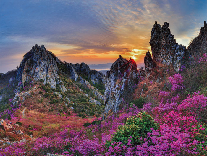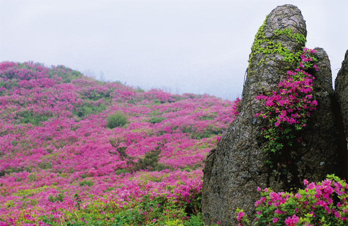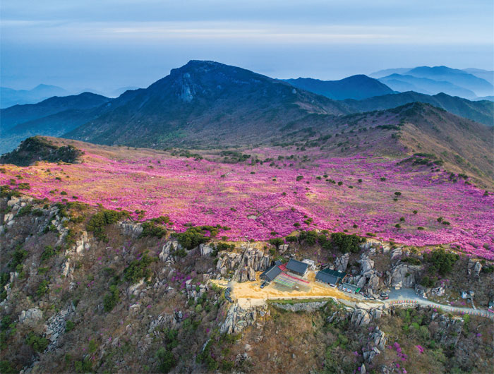 대구와 경북 청도에 걸쳐 있는 비슬산(1083m) 정상부의 진달래 군락과 대견사. 해발 1000m에 이르는 고지대에 믿을 수 없을 만큼 넓은 진달래 화원이 펼쳐진다. 비슬산은 진달래가 대규모로 군락을 이룬 산들 중에서 가장 높은 산으로 꼽힌다. 사진=대구시청
