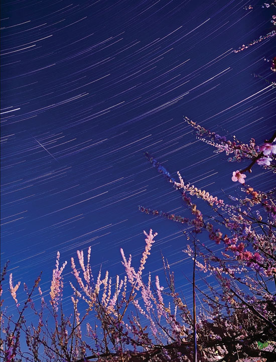 산보다 산 입구가 더 유명한 산이 전남 광양 쫓비산이다. 봄이면 산기슭의 매화나무들이 일제히 꽃을 피워 전국의 상춘객을 끌어들인다. 매화 농장 주인의 허락으로 봄 밤을 앵글에 담았다. 별과 꽃이 어우러져 봄날이 더 빠르게 지나가는 것만 같다. 사진=민미정좋지 않은가. 이 무질서하고 화려한 테러에 기꺼이 포로가 되는 것이. 지금 이 순간, 산은 분홍빛 화약을 터뜨리며 세상을 향해 가장 평화로운 도발을 하고 있다. 마음속에 쟁여 둔 무거운 고민은 잠시 접어 두어도 좋다. 저 꽃들이 펼치는 유치한 축제에 몸을 던져, 꽃멀미에 취해 비틀거리는 사치를 부려도 좋을 계절이다. 연둣빛 새잎이 돋기 전, 산이 허락한 이 짧고 강렬한 분홍의 전성기를 우리는 온몸으로 맞이해야 한다.⊙